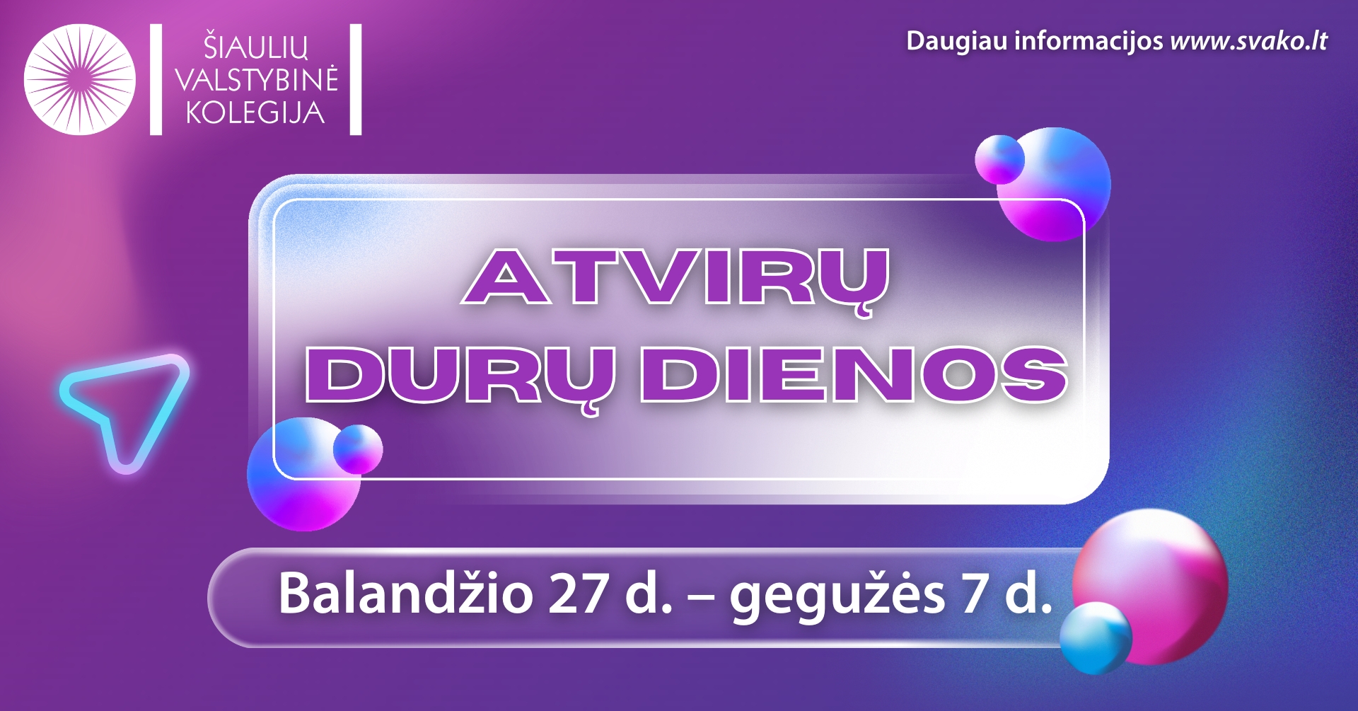 Balandžio 27–gegužės 7 dienomis kviečiame dalyvauti studijų programų pristatymuose ir praktinėse dirbtuvėse, kurios leis ne tik daugiau sužinoti apie Šiaulių valstybinės kolegijos siūlomas studijas, bet ir jas patirti!