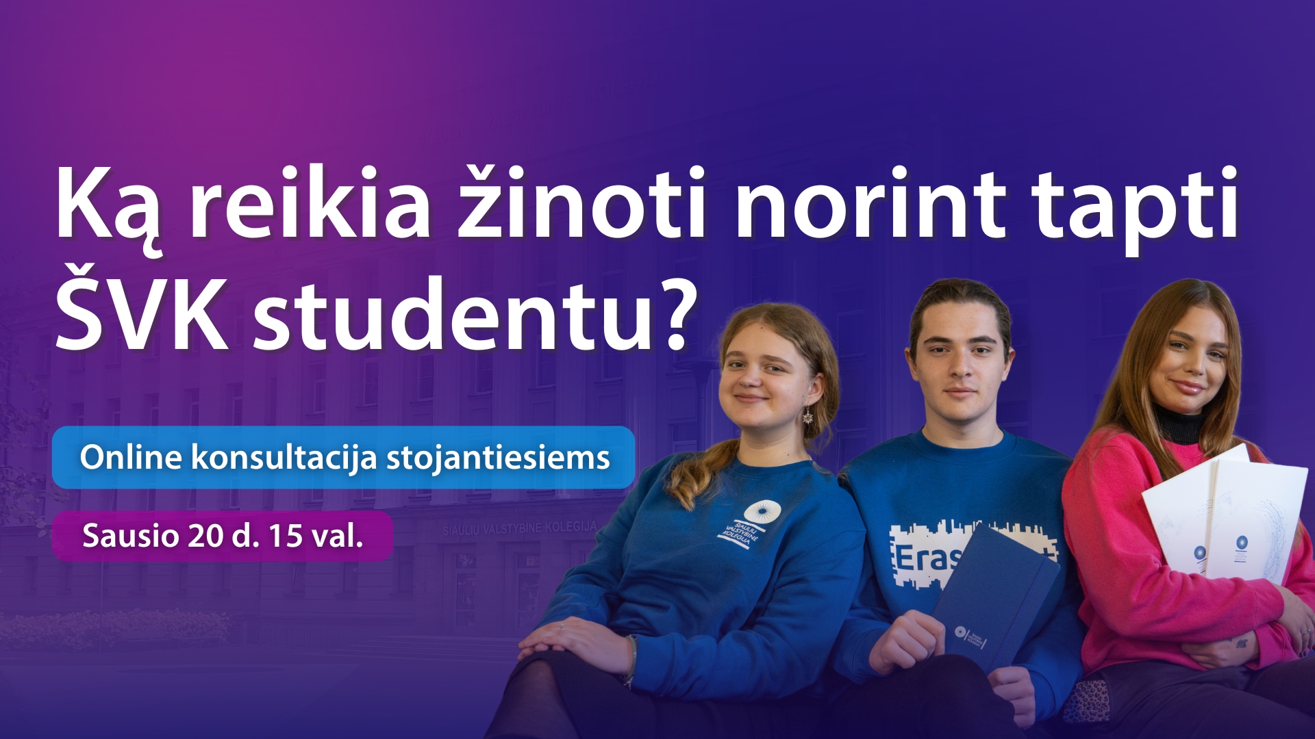 Kviečiame į informacinį susitikimą apie priėmimą į Šiaulių valstybinę kolegiją! Planuojate studijas 2026 metais ir norite sužinoti daugiau apie stojimo galimybes? Kviečiame dalyvauti nuotoliniame informaciniame susitikime, skirtame visiems, besidomintiems studijomis Šiaulių valstybinėje kolegijoje.