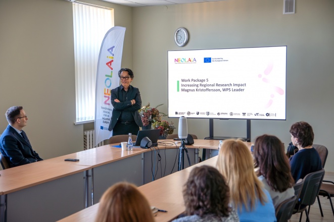 On April 13–15, Dr. Magnus Kristoffersson (Örebro University, Sweden), leader of Work Package 5 (Increasing Regional Research Impact) within the NEOLAiA European University Alliance, visited Šiaulių valstybinė kolegija / Higher Education Institution (ŠVK). The visit was not just a formal meeting – it was an opportunity to better understand each other’s strengths and explore how collaboration within NEOLAiA could be made more meaningful and impactful.