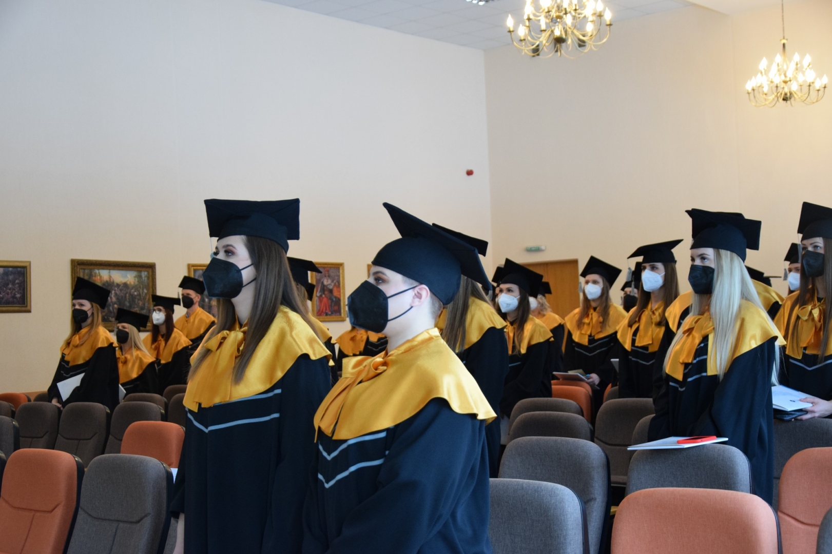 Diplomų įteikimo ceremonija vyko laikantis visų galiojančių saugumo reikalavimų, renginyje dalyvavo tik kolegijos administracijos atstovai, fakulteto bendruomenės nariai ir studentai, kuriems įteikti aukštąjį išsilavinimą įrodantys diplomai.