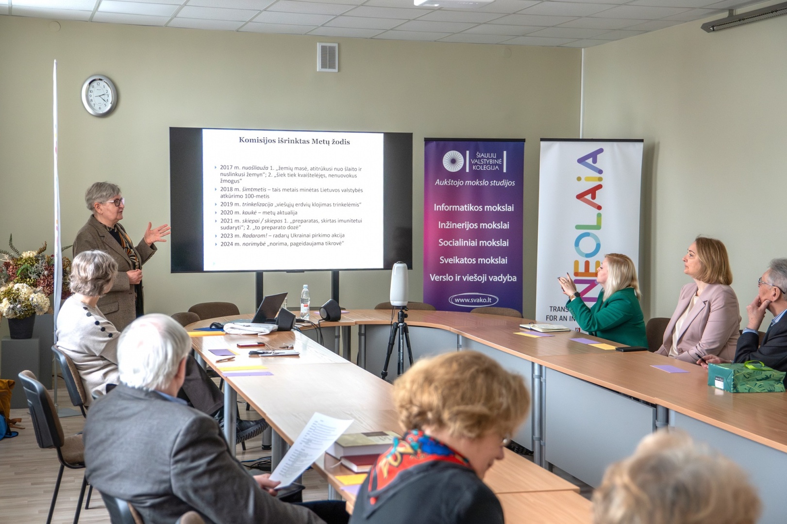 Viešnios paskaitoje „Metų žodžio ir Metų posakio rinkimai: ką jie atneša ir ką apie mus pasako?“ dalyvavo ne tik Kolegijos bendruomenės nariai, bet ir miesto visuomenė. Lektorė susirinkusiesiems papasakojo apie įvairių bendruomenių organizuojamus žodžių rinkimus, prisiminė, kaip ir kada Metų žodis ir Metų posakis pradėti rinkti Lietuvoje, supažindino su šio sumanymo iniciatoriais ir vykdytojais. Rita Urnėžiūtė atskleidė, kaip siūlomi pretendentai, kiek svarbi yra visuomeninės komisijos ir kalbos vartotojų nuomonė. Buvo prisiminti ir aptarti per beveik dešimtmetį mūsų šalyje išrinkti žodžiai ir posakiai, aptarta, kas lemia, kad kuris nors žodis ar posakis tampa savotišku metų ženklu, atspindi to laikotarpio aktualijas, taikliausiai pavadina naujus reiškinius.