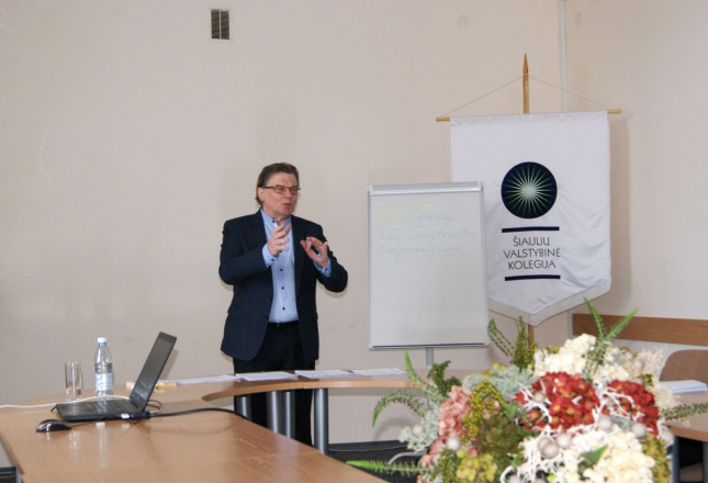 Paskutinis šių metų Lietuvių kalbos dienų renginys Kolegijoje – prof. dr. Skirmanto Valento paskaita „Lingvistinė kultūros rekonstrukcija“. Gausiai susirinkusiai akademinei bendruomenei profesorius papasakojo apie žodžiuose užkoduotas prasmes, pateikė įdomių pavyzdžių.