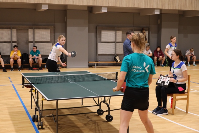 Mūsų aukštosios mokyklos merginos po įnirtingų kovų, tik 1 tašku nusileidusios Vilniaus kolegijos tenisininkėms, iškovojo II vietą ir džiaugėsi sidabro medaliais. Pirmoji vieta atiteko Vilniaus kolegijos stalo tenisininkėms, Kauno kolegijos merginos liko trečioje vietoje.