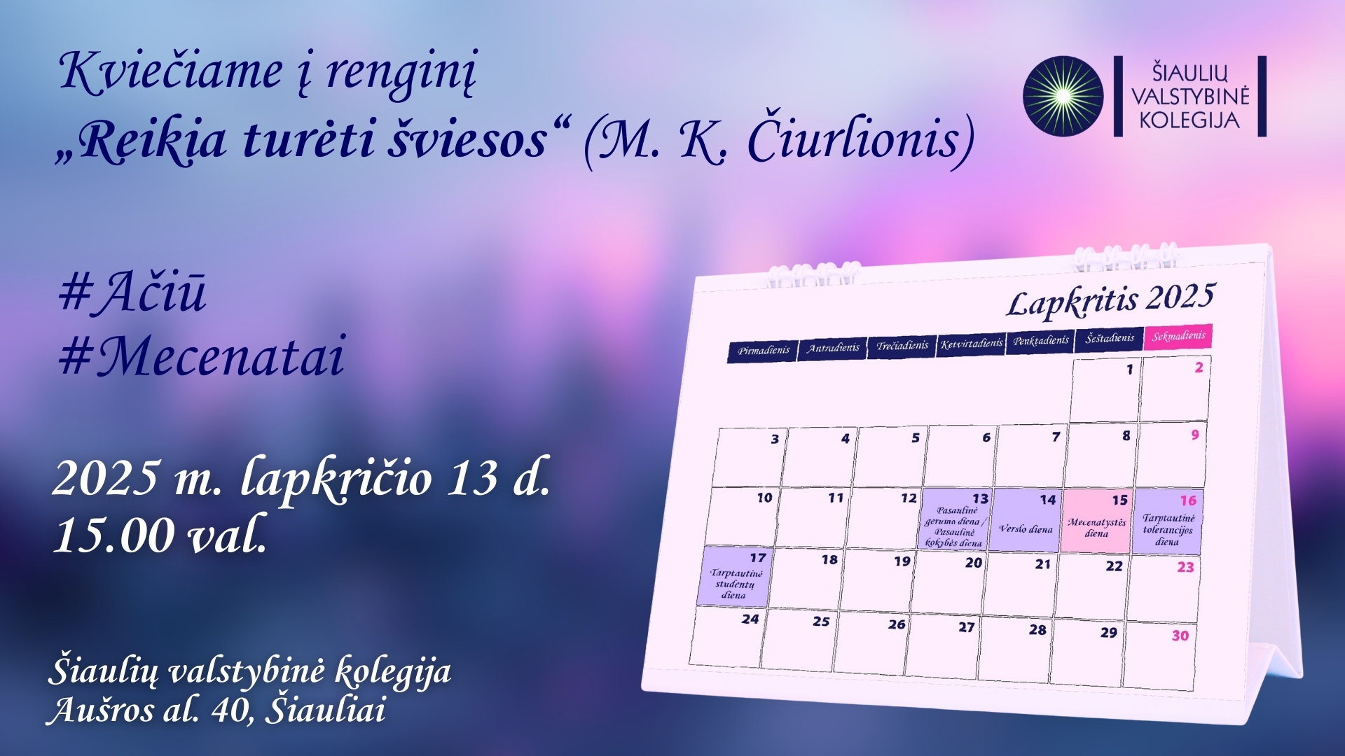 Visus Šiaulių valstybinės kolegijos bendruomenės narius kviečiame į tradicinį padėkos mecenatams renginį, kuris vyks lapkričio 13 d. 15.00 val. Šiaulių valstybinės kolegijos aktų salėje (Aušros al. 40, Šiauliai).