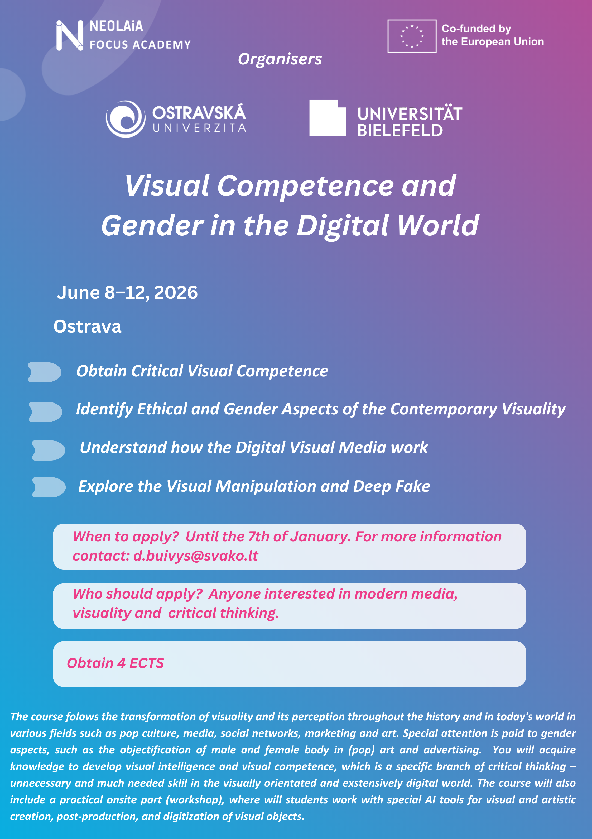 NEOLAiA aljanso partneris Ostravos universitetas įsikūręs Ostravoje, Čekijoje, kviečia studentus dalyvauti „Erasmus+“ BIP Fokus akademijos kurse tema: "Visual Competence and Gender in the Digital World”